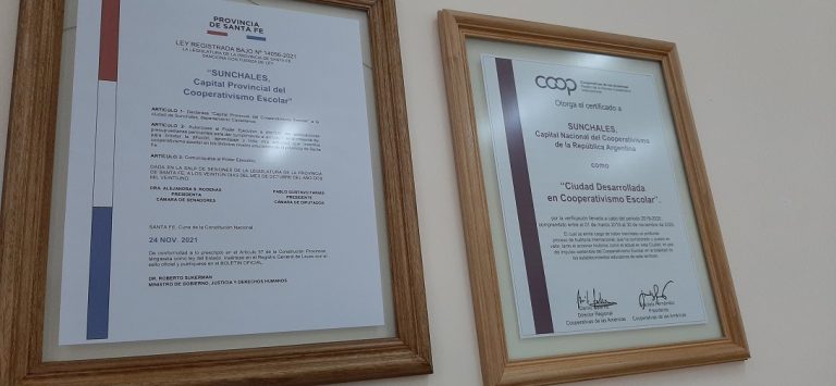 Tenemos dos títulos de los que nos enorgullecemos uno porque Sunchales es “Capital Nacional de Cooperativismo Escolar” y otro expedido por la Alianza Cooperativa Internacional como “Ciudad desarrollada en Cooperativismo Escolar” expedido por la Alianza Cooperativa Internacional. Esto quiere decir que todas las escuelas tienen, al menos, una cooperativa escolar”.