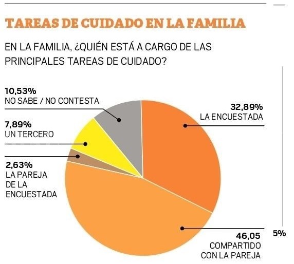 Más de un 78% de las mujeres están encargadas de las principales tareas de cuidado del hogar. El 46,05% lo hacen en conjunto con su pareja y el 32,89% son el principal referente de cuidado en la familia. Hay un porcentaje menor, el 7,89% que deja en un tercero las principales tareas de cuidado y un 2,63% se encarga la pareja de la encuestada.