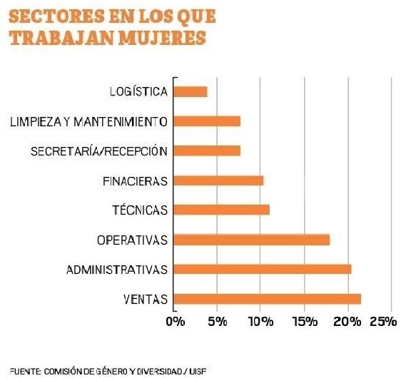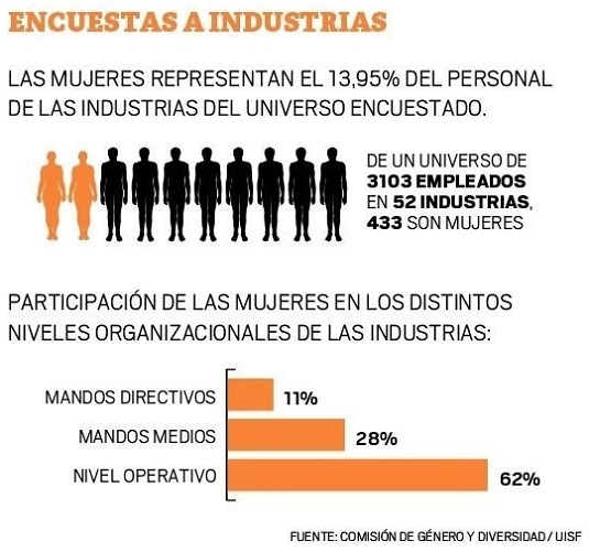 En la presidencia de las empresas el resultado fue de seis presididas por una mujer; dos que tienen hombres y mujeres en la presidencia y 44 tienen de presidente a un hombre. Un 37% de las industrias tienen espacios pensados para la mujer, como baños exclusivos, vestuarios y sala de lactancia.